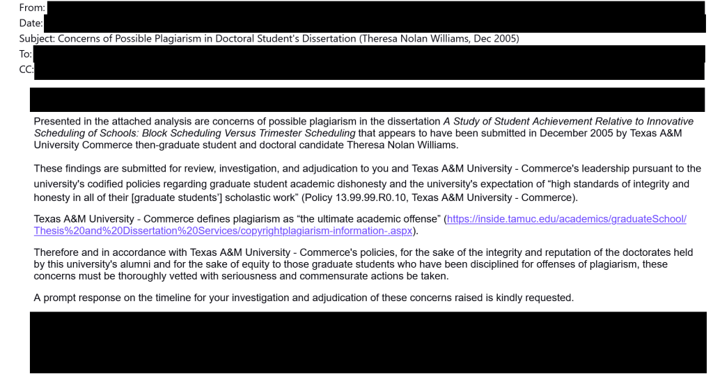 Currently circulating is a supposed copy of a request made to Texas A&M University – Commerce (TAMUC) to investigate plagiarism in Superintendent Williams’ dissertation that she submitted as part of her degree requirement for a doctorate in education from TAMUC.