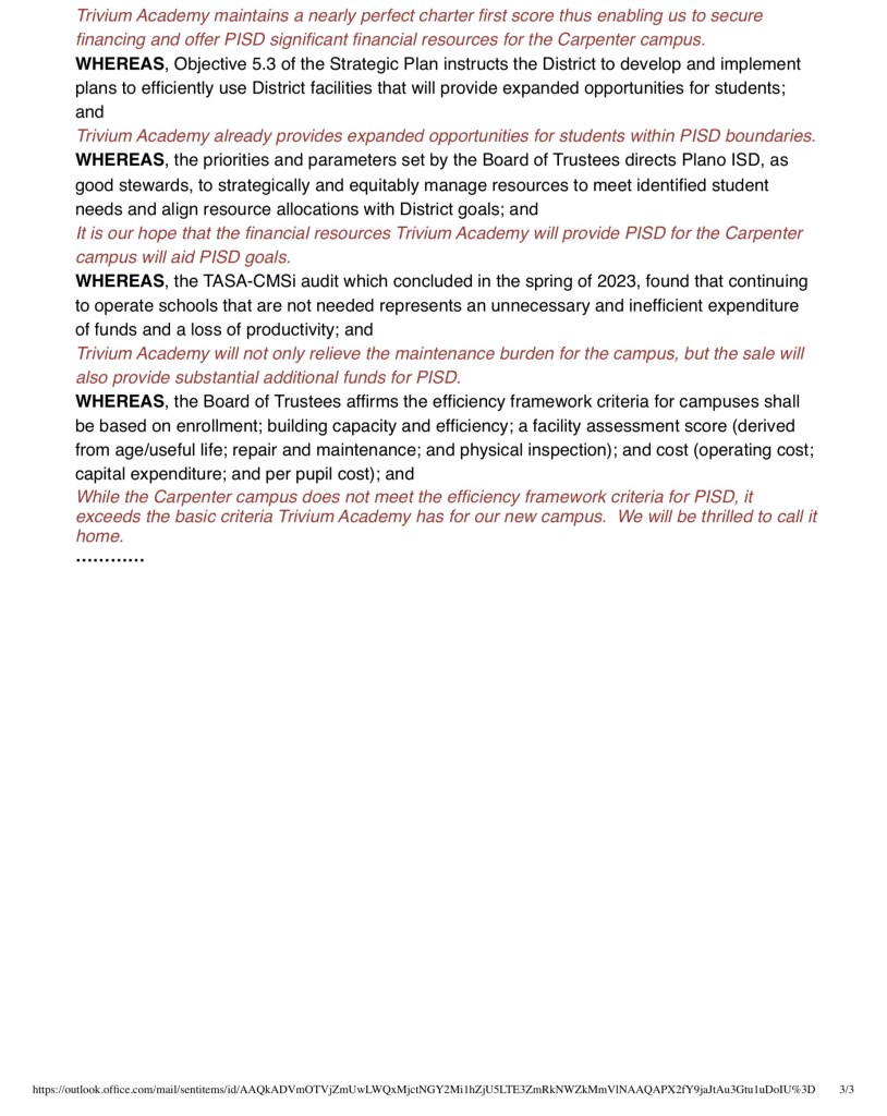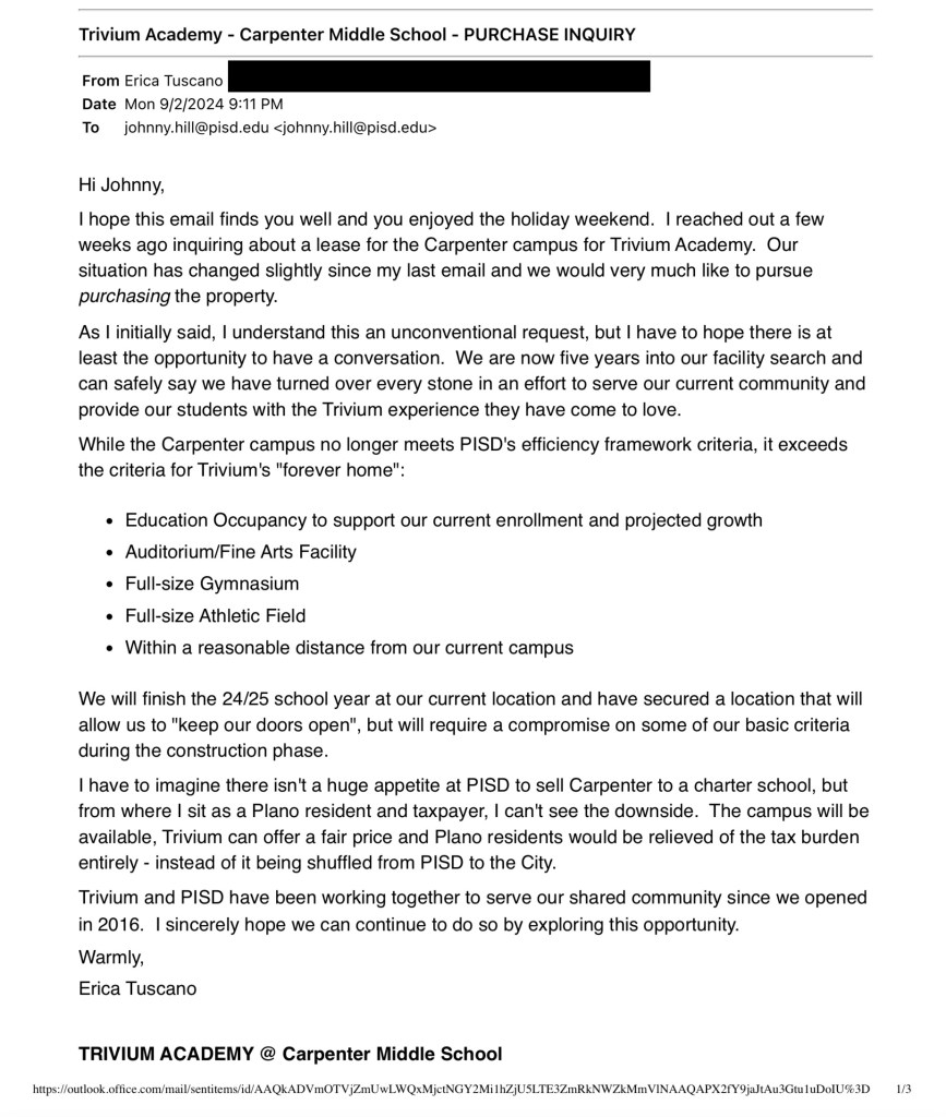 Then there’s the issue of what the Board and District are not saying, which is how many other interested parties reached out to them about purchasing these closing campuses. As detailed in this email below, Trivium Academy reached out to Plano ISD about acquiring one of the campuses, meaning Plano ISD wouldn’t be using our tax dollars to demolish the building and would be maximizing profit for taxpayers.