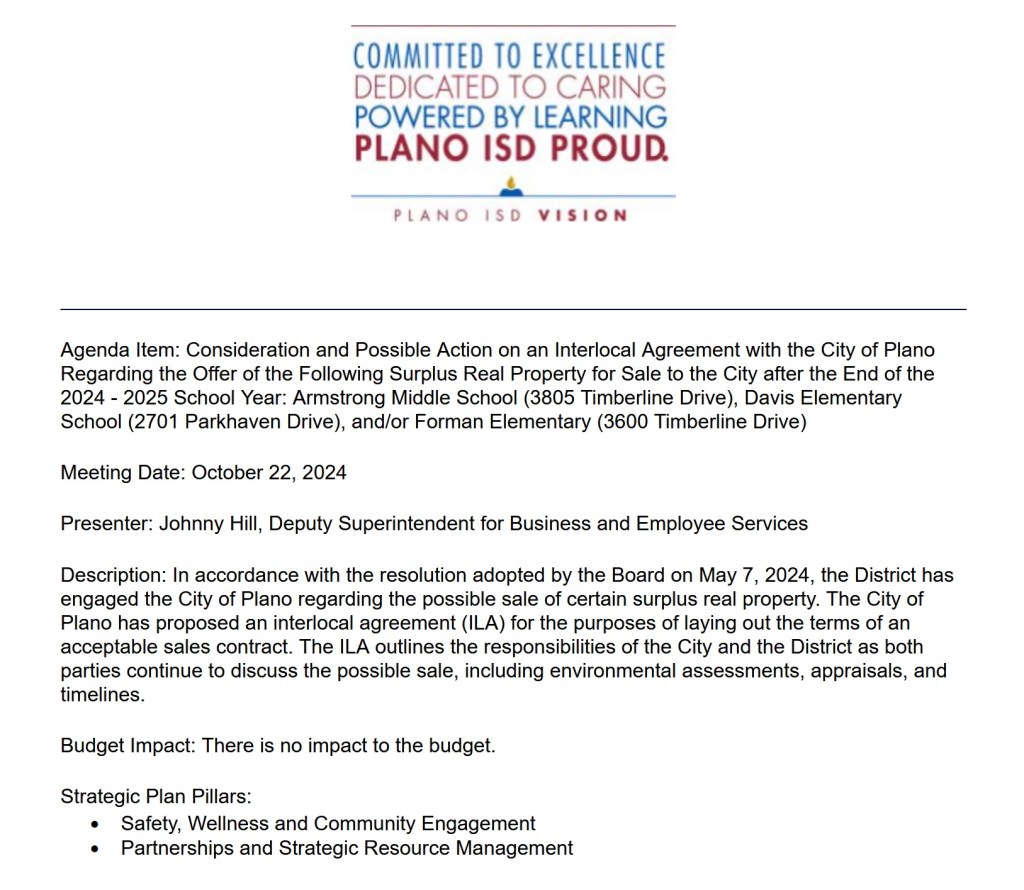 After their initial public announcement of this plan at their September 17, 2024 Work Session Meeting, the Board and District Administration followed up at the October 22, 2024 Work Session Meeting with an interlocal agreement between Plano ISD and the City of Plano.